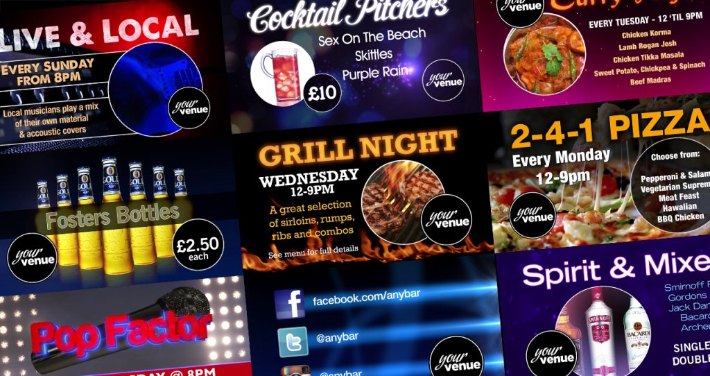 Stay ahead of the competition with 100s of ready-made templates for food and beverage brands, sporting events, entertainment and social media. Customise the artwork, sales messages and price points with a simple point-and-click editor.